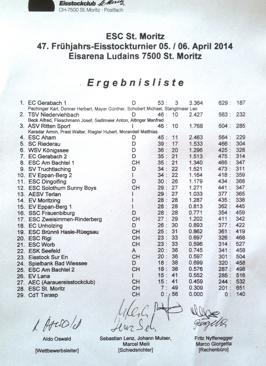 Mit 53:3 Punkten wurde das int. Turnier in St. Moritz gewonnen. Der EC Gerabach nahm mit 2 Mannschaften an diesem traditionellen Turnier teil.